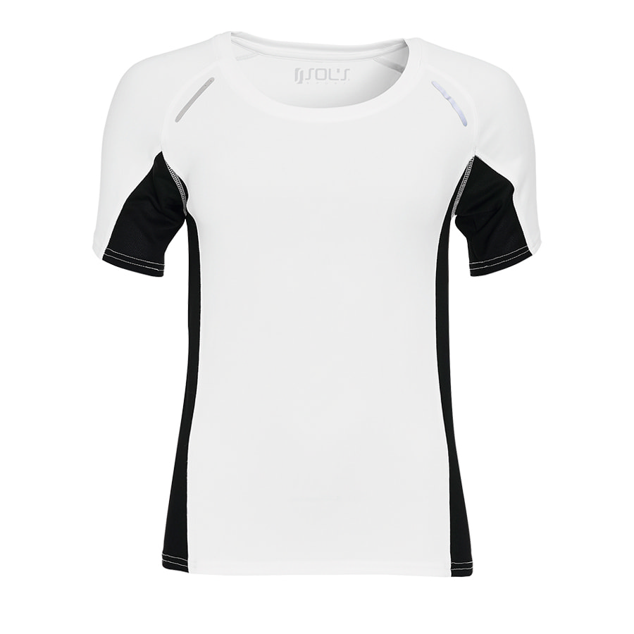 Женская футболка с рукавами реглан для занятий спортом со светоотражающими элементами. Боковые вставки из "дышащей" сетки предназначены для вентиляции и отвода влаги.