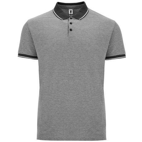 Футболка поло меланжевого цвета с короткими рукавами. Воротник и манжеты рукавов однотонного цвета в рубчик 1 x 1 с контрастной декоративной полосой. Внутренняя планка с декоративной контрастной лентой на три пуговицы. Вырез внизу по бокам с усиленными шв