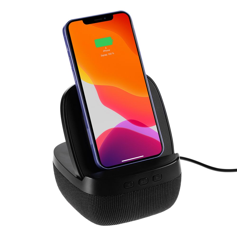 Колонка c беспроводной зарядкой Esca — многофункциональное устройство, которое позволяет слушать музыку по Bluetooth и одновременно заряжать смартфон или наушники. Мощности динамика 5 Вт будет достаточно, чтобы наполнить звуком помещение до 30 м?.