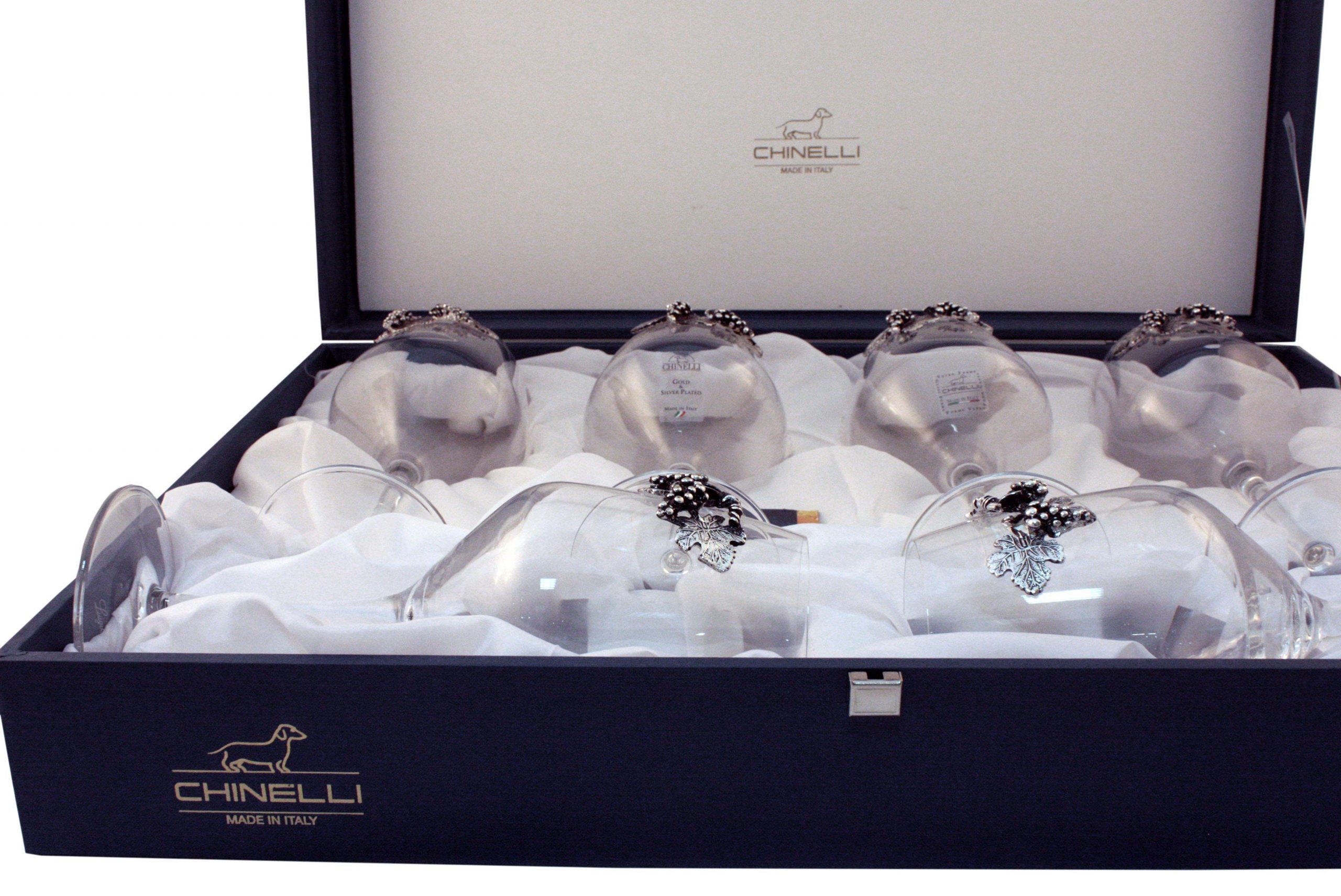 Бокалы для вина – украшение стола. Если Вы задались целью купить бокалы для вина, то к выбору стоит отнестись серьезно. Красивые бокалы позволят подчеркнуть общую идею оформления, а также качество и вкусовые свойства напитка. Набор бокалов "UVA BLACK" станет прекрасным подарком как родным и близким, так и женщине - руководителю. Коллекция CHINELLI – это плавные линии, безупречное качество и оригинальный дизайн. Изящная отделка серебром делает каждый предмет идеальным украшением вашего интерьера. Марка CHINELLI это 40 лет бесценного опыта ручного производства, безупречного итальянского вкуса и европейского качества. Бренд воплощает в себе стиль и качество, соответствующий стандарту "Made in Italy". Компания расположена в долине Lumezzane провинции Brescia (Италия), которая с давних времен славится высоким мастерством в области обработки металла. На протяжении многих лет компания совмещает искусную работу ремесленников с промышленным производством. Характерной чертой CHINELLI является внедрение новейших технологий и способность быстро адаптироваться к изменчивости потребности рынка. Изделия марки CHINELLI с легкостью превратят встречу с друзьями в непревзойденную атмосферу праздника и уюта. Они отличаются безупречным качеством, роскошью исполнения и одновременно классической простотой стиля. Изделия изготавливаются из хрусталя, стекла, металла и даже фарфора, в декорировании используется покрытие серебром и золотом, инкрустация кристаллами Swarovski. Все изделия упакованы в фирменную подарочную упаковку с логотипом CHINELLI и сертификатом внутри.