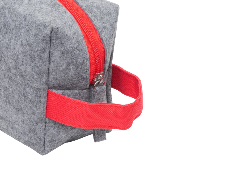 Косметичка из РПЕТ фетра с ручкой Felt, серый с красным с логотипом компании - отличный способ заявить вашу корпоративную идентичность.