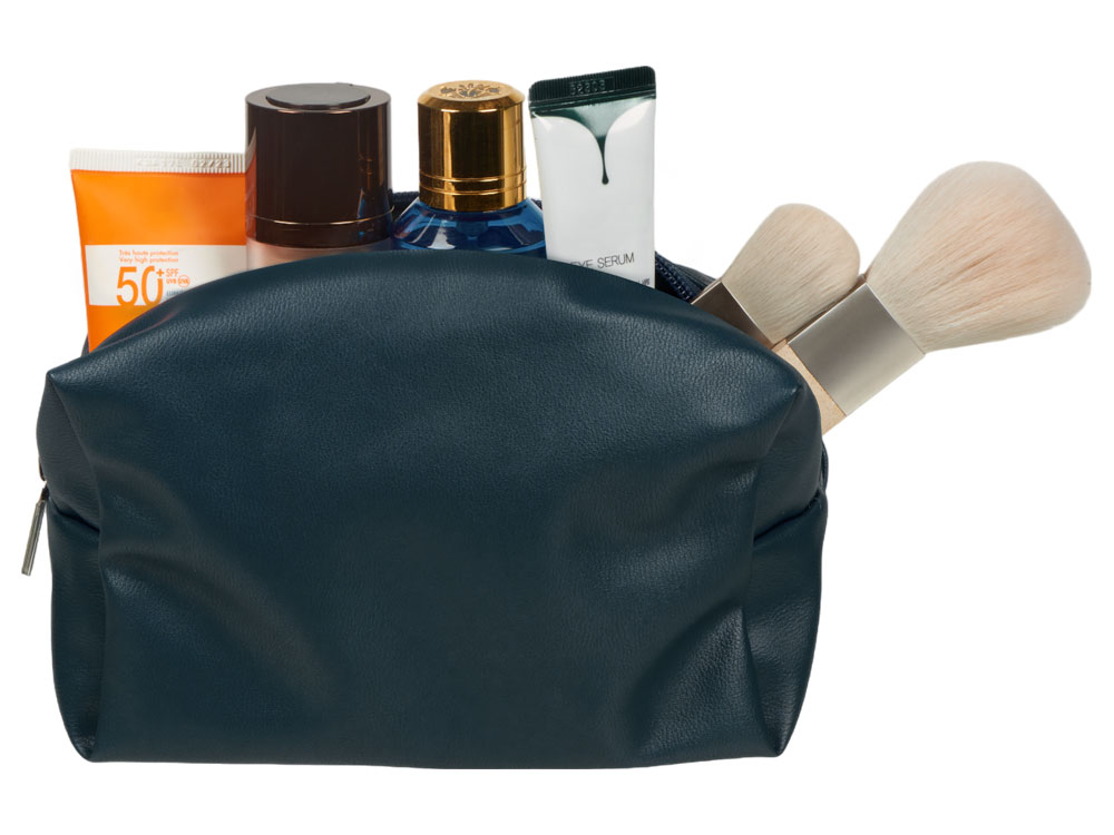 Косметичка из искусственной кожи удобной и вместительной формы. Внутри подклад серого цвета с карманом для маленьких предметов.