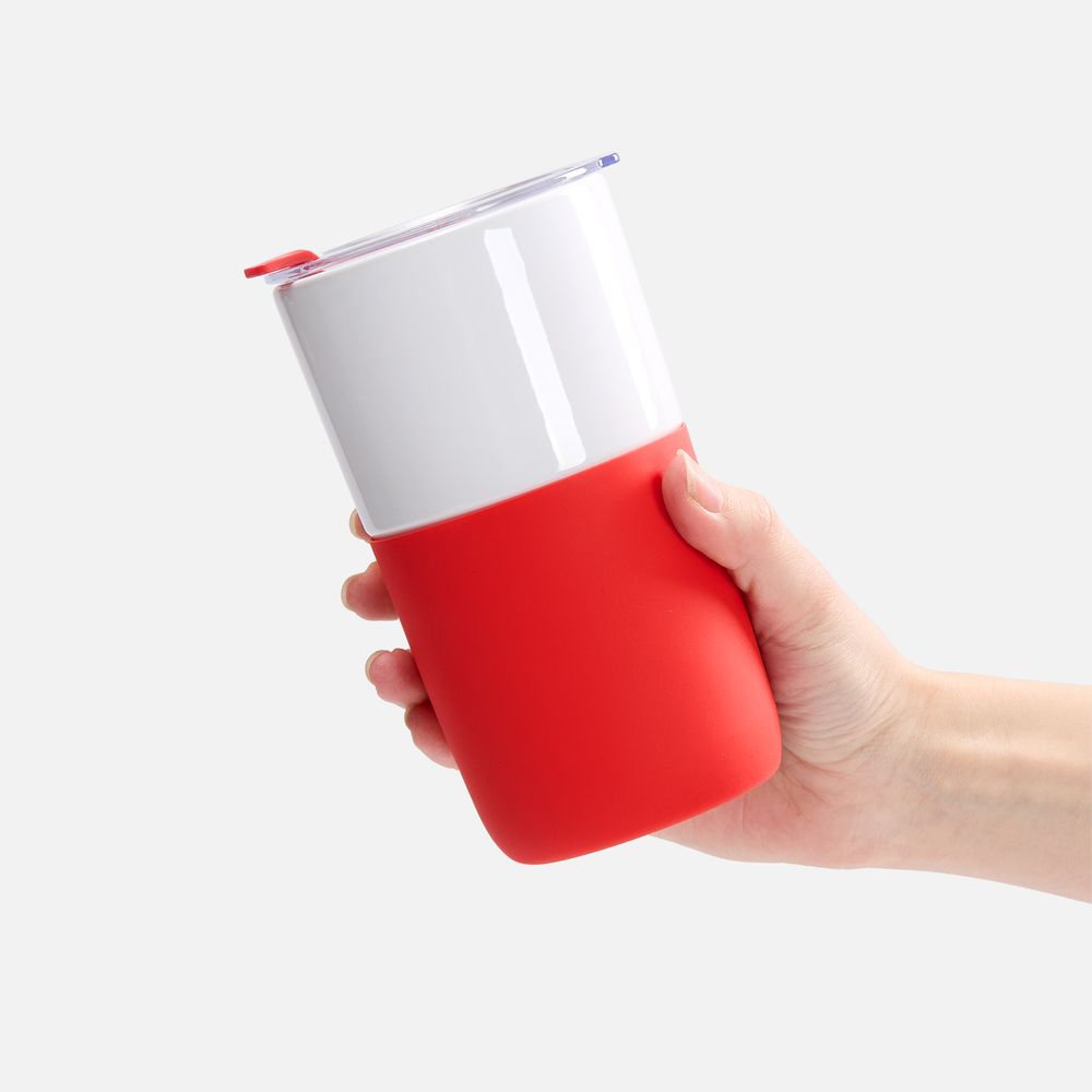 Прочная керамика — и напиток не впитает посторонних запахов и вкусов, силиконовый рукав — и стакан не обожжет руки, плотная крышка — и содержимое не прольется и не остынет слишком быстро.