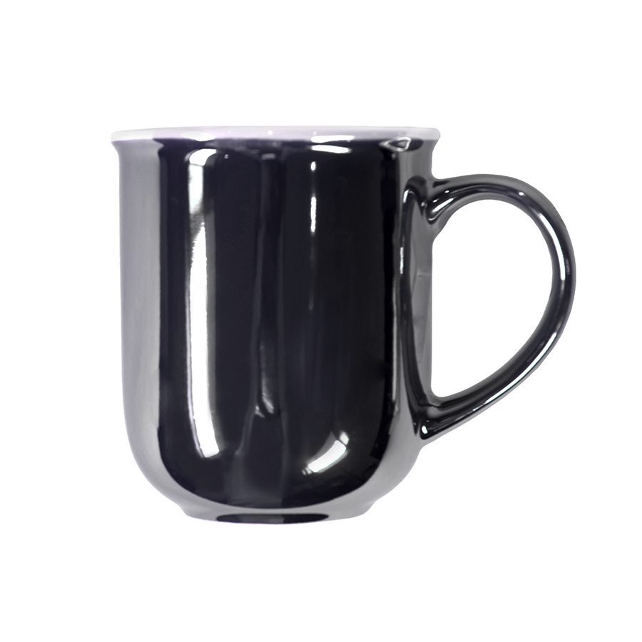 Кружка необычной, скругленной внизу формы, дополнена белым кантом по верхнему краю и актуальным покрытием с жемчужным блеском или эффектом перламутра.