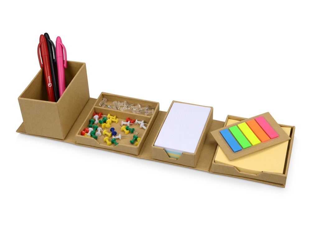 Оригинальная подставка для канцелярии Брик в сложенном виде представляет собой куб. А в разложенном – она превращается в удобный настольный прибор с отделениями для стикеров, бумаги для записей, скрепок и ручек. Настольный куб Брик сделан из бумаги и картона, и является отличным экосувениром.