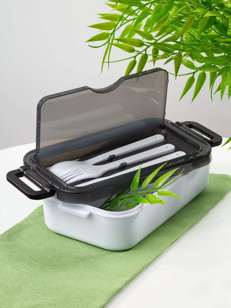 Удобная конструкция с крышкой на защелках обеспечивает надежную фиксацию. Специальное отделение под крышкой позволяет хранить столовые приборы, освобождая дополнительное пространство в сумке.