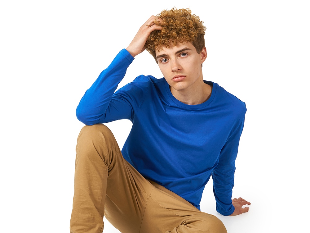 Футболка с длинным рукавом комфортной посадки с боковыми швами. Горловина обработана рибом 1х1 и тесьмой по спинке. Футболка выполнена из хлопкового джерси.
