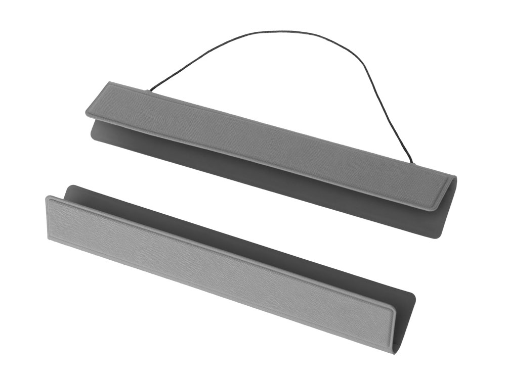 Рамка состоит из двух элементов, выполненных из экокожи, которые складываются на манер удлиненной книжки и внутри имеют магниты. Один из элементов имеет шнур для подвешивания — это верхняя часть рамки.