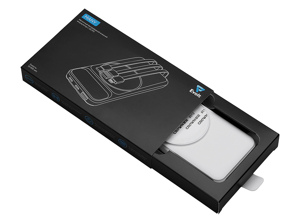 Компания «Эклектика BY» осуществляет нанесение логотипа на сувенирную продукцию: Магнитный беспроводной внешний аккумулятор со встроенными кабелями Мэни,быстаря зарядка, 10000 мАч, белый. Арт. 459740