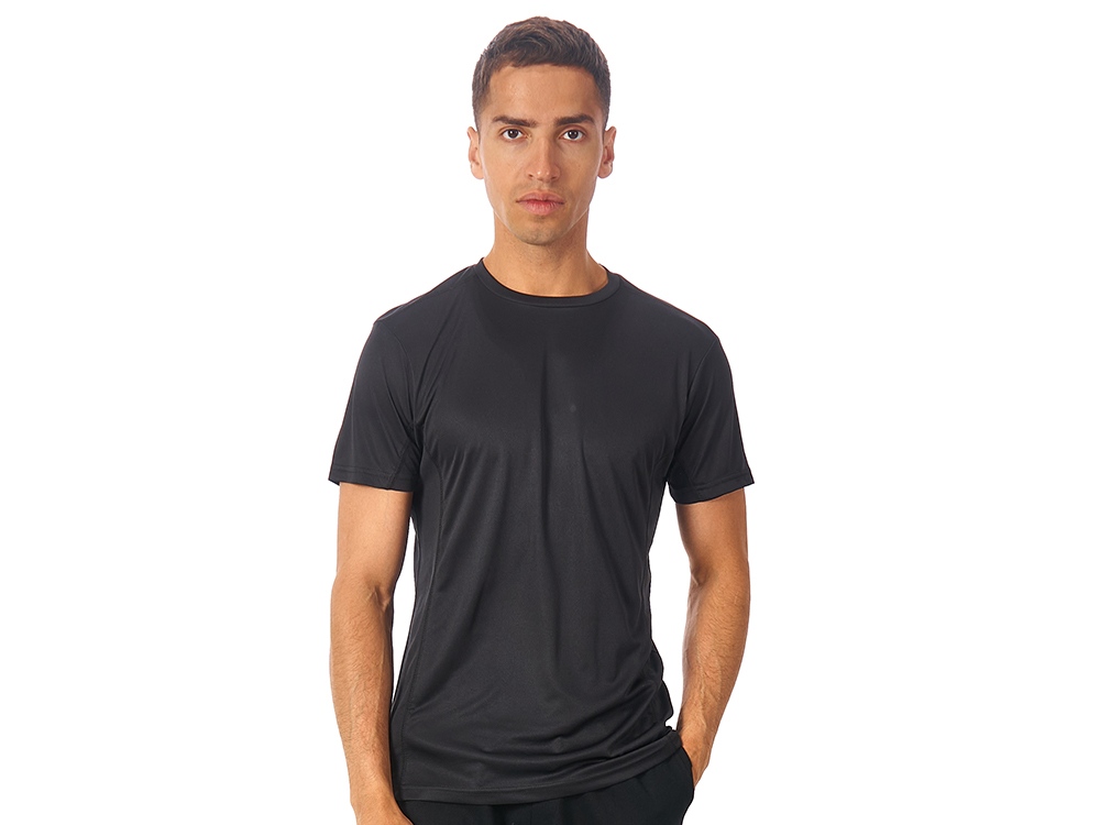 Мужская спортивная футболка выполнена из двух разных видов полотна: спинка и перед из интерлока имеют гладкую поверхность, а декоративные вставки выполнены из спортивной сетки ячеистой структуры. Благодаря наличию таких вставок воздух свободно проникает под футболку, охлаждая кожу во время спортивных нагрузок.