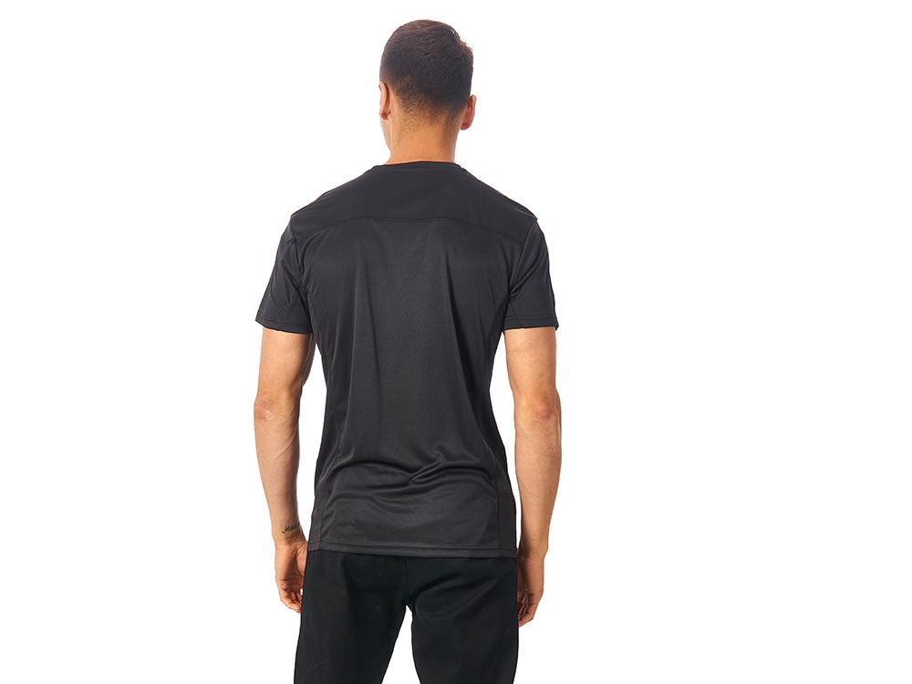 Мужская спортивная футболка выполнена из двух разных видов полотна: спинка и перед из интерлока имеют гладкую поверхность, а декоративные вставки выполнены из спортивной сетки ячеистой структуры. Благодаря наличию таких вставок воздух свободно проникает под футболку, охлаждая кожу во время спортивных нагрузок.