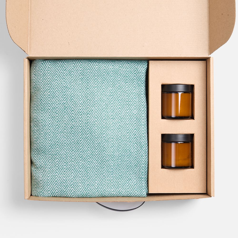 Материал: плед - шерсть, 15%; хлопок, 5%; полиэстер, 60%; акрил, 20%, плотность 200 г/м?; подсвечник - стекло, крышка - пластик; свеча - парафин, соевый воск, парфюмерная композиция; коробка - микрогофрокартон, Т-23Е