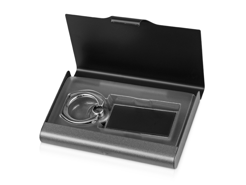 Главная ->Корпоративные подарки и рекламные сувениры на складе -> Сувенирная электроника -> Аксессуары для телефона -> Набор Slip: визитница, держатель для телефона, серый/черный