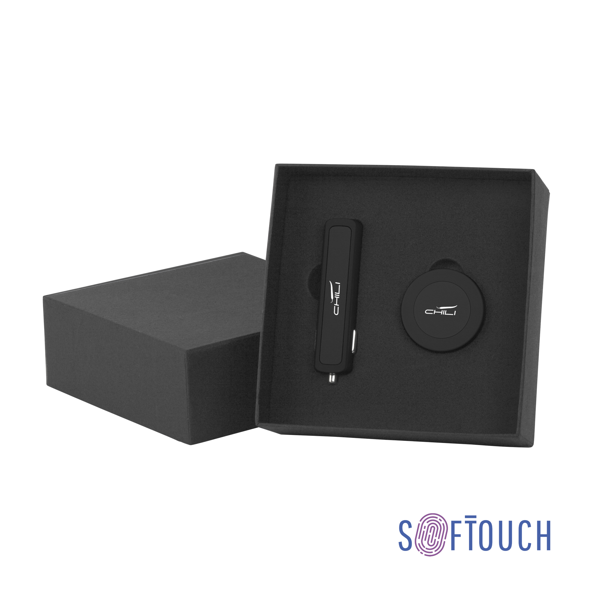 Компания «Эклектика BY» осуществляет нанесение логотипа на сувенирную продукцию: Набор автомобильное зарядное устройство "Slam" + магнитный держатель для телефона "Allo" в футляре, черный, покрытие soft touch. Арт. 136768