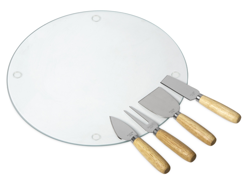Набор для сыра с круглой стеклянной доской 5в1 с логотипом компании - отличный способ заявить вашу корпоративную идентичность.