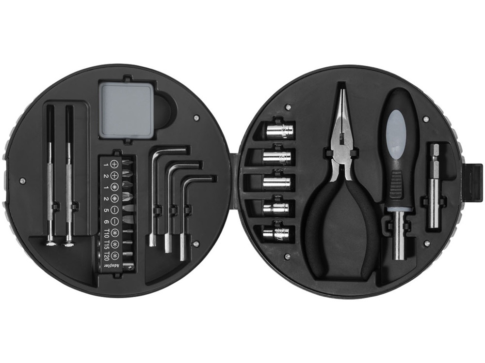 Набор из 25 инструментов в форме колеса, черный/серебристый с логотипом компании - отличный способ заявить вашу корпоративную идентичность.