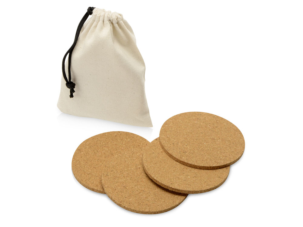 Набор костеров Bali из пробки в хлопковом мешке, 4 шт с логотипом компании - отличный способ заявить вашу корпоративную идентичность.