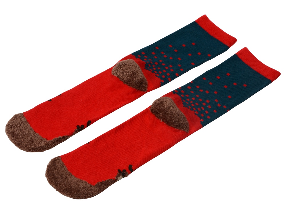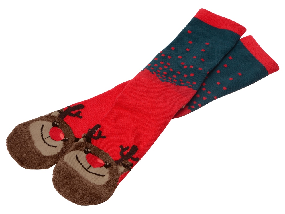 Рождественские носки прекрасно подойдут на роль подарка, который создает праздничное настроение. Этот набор состоит из двух пар, которые упакованы в мешочек из натурального хлопка. Одна пара украшена мягкими пушистыми мордочками рождественских оленей, а принт на второй изображает сапожки Санта Клауса. Ткань - смесь хлопка, полиэстера и спандекса, что обеспечивает носкам износостойкость, а мягкая широкая резинка – удобную посадку по ноге. Мешочек-упаковку можно брендировать по вашему желанию.