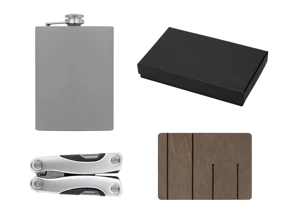 Компания «Эклектика BY» осуществляет нанесение логотипа на сувенирную продукцию: Набор с мультитулом и фляжкой Путешественник 2.0., серый. Арт. 430721