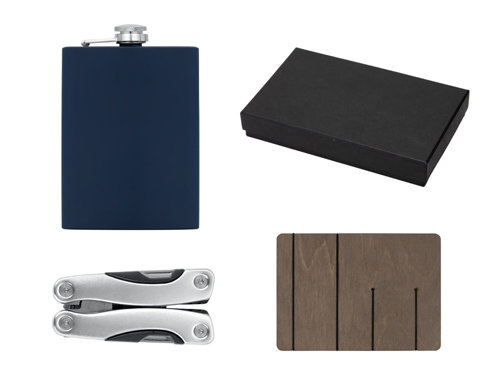 Компания «Эклектика BY» осуществляет нанесение логотипа на сувенирную продукцию: Набор с мультитулом и фляжкой Путешественник 2.0., темно-синий. Арт. 430719
