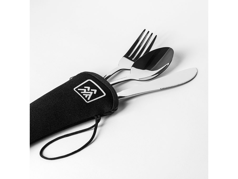 Набор столовых приборов из нержавеющей стали в практичном неопреновом футляре. Включает в себя вилку, нож и ложку, идеально подходящие для того, чтобы брать их с собой куда угодно.