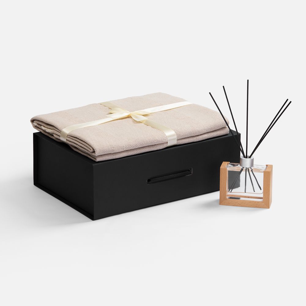 Материал: флакон - стекло, палочки из файбера; подставка для флакона - дерево; плед - хлопок 95%, полиэстер 5%, плотность 300 г/м?; коробка - переплетный картон, бумага Malmero