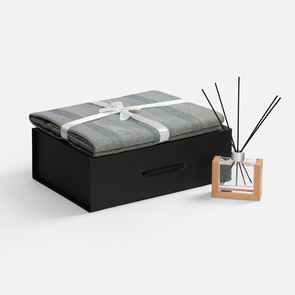 Материал: флакон - стекло, палочки из файбера; подставка для флакона - дерево; плед - хлопок 95%, полиэстер 5%, плотность 300 г/м?; коробка - переплетный картон, бумага Malmero
