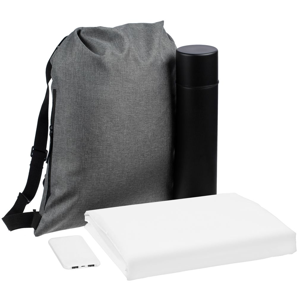 Материал: термос - нержавеющая сталь, пластик; аккумулятор - пластик, покрытие софт-тач; дождевик - полиэстер 100%, плотность 60 г/м?; таффета; рюкзак - полиэстер, 300D