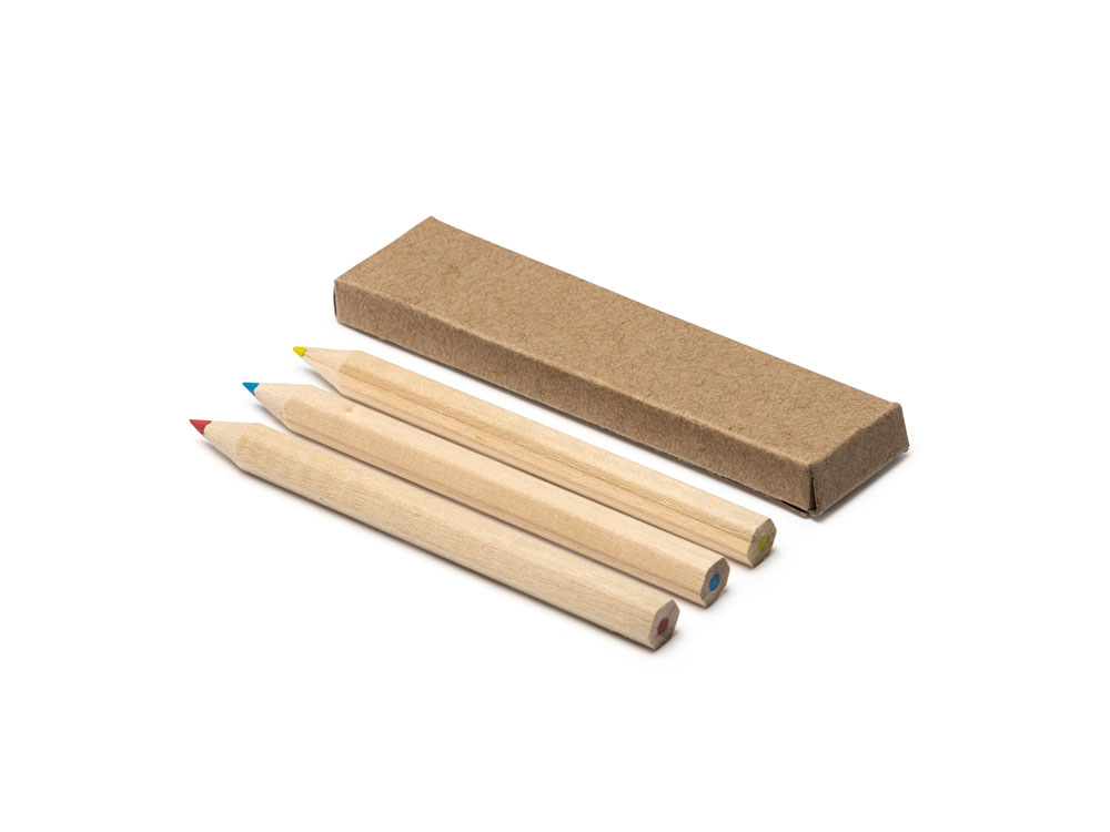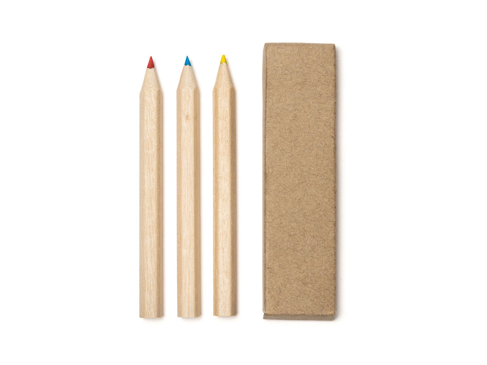 Набор из 3 цветных деревянных карандашей, упакованных в коробку из переработанного картона.