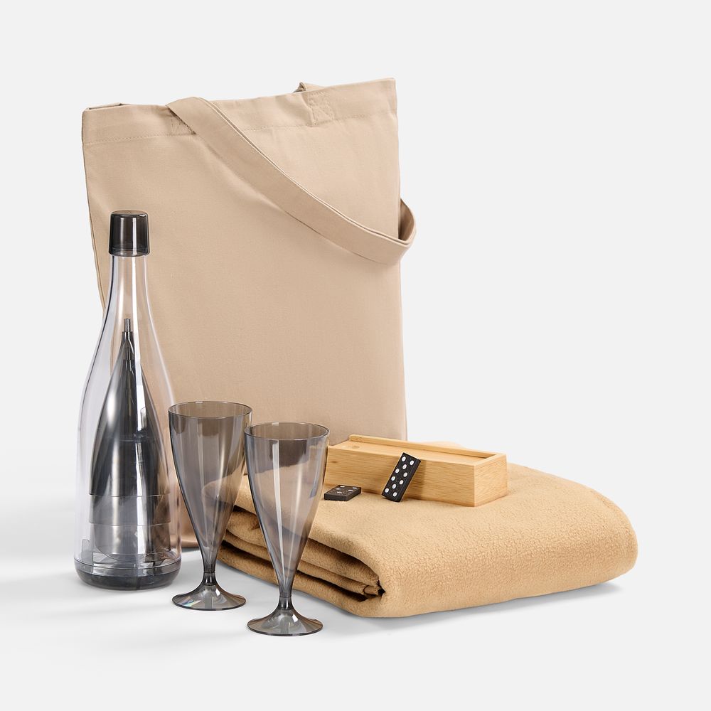 Материал: плед - флис, плотность 180 г/м?; набор бокалов - пластик; футляр для домино - бамбук; костяшки - МДФ; сумка - хлопок 100%, плотность 220 г/м?; саржа