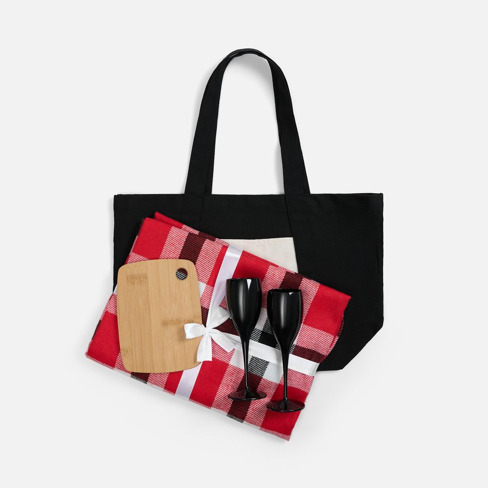 Материал: плед - шерсть 15%; хлопок 5%; полиэстер 60%; акрил 20%, плотность 200 г/м?; шопер - полиэстер 60%, переработанный хлопок 40%, плотность 340 г/м?; бокалы - пластик; доска - бамбук