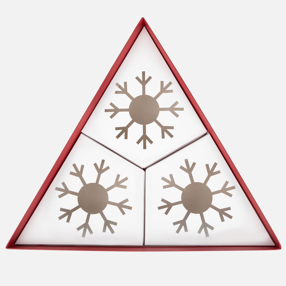 А еще Finery Trio — это маленькое произведение искусства, созданное с вниманием к деталям: шары диаметром 10? см бережно уложены в индивидуальные ложементы с изящным вырезом в форме снежинки, а стильная коробка придает подарку особую торжественность. Нестандартная треугольная форма упаковки подчеркивает оригинальность композиции и делает презент по?настоящему запоминающимся.