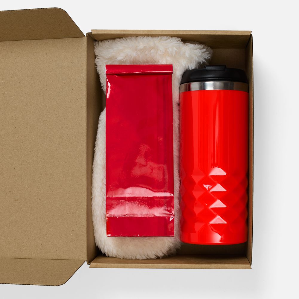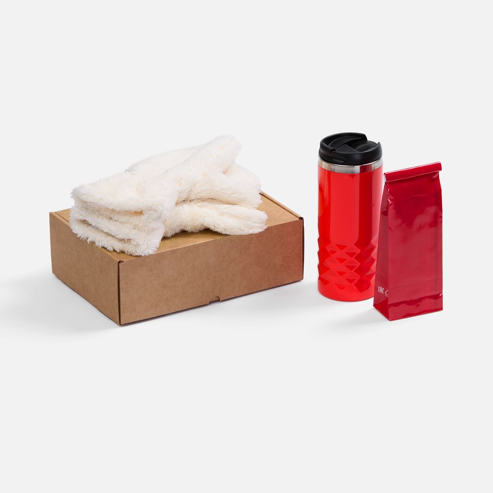 Материал: термостакан, крышка - пластик; внутренняя стенка - нержавеющая сталь; варежки - полиэстер 100%, плотность 280 г/м?, длинноворсовый флис; коробка - микрогофрокартон