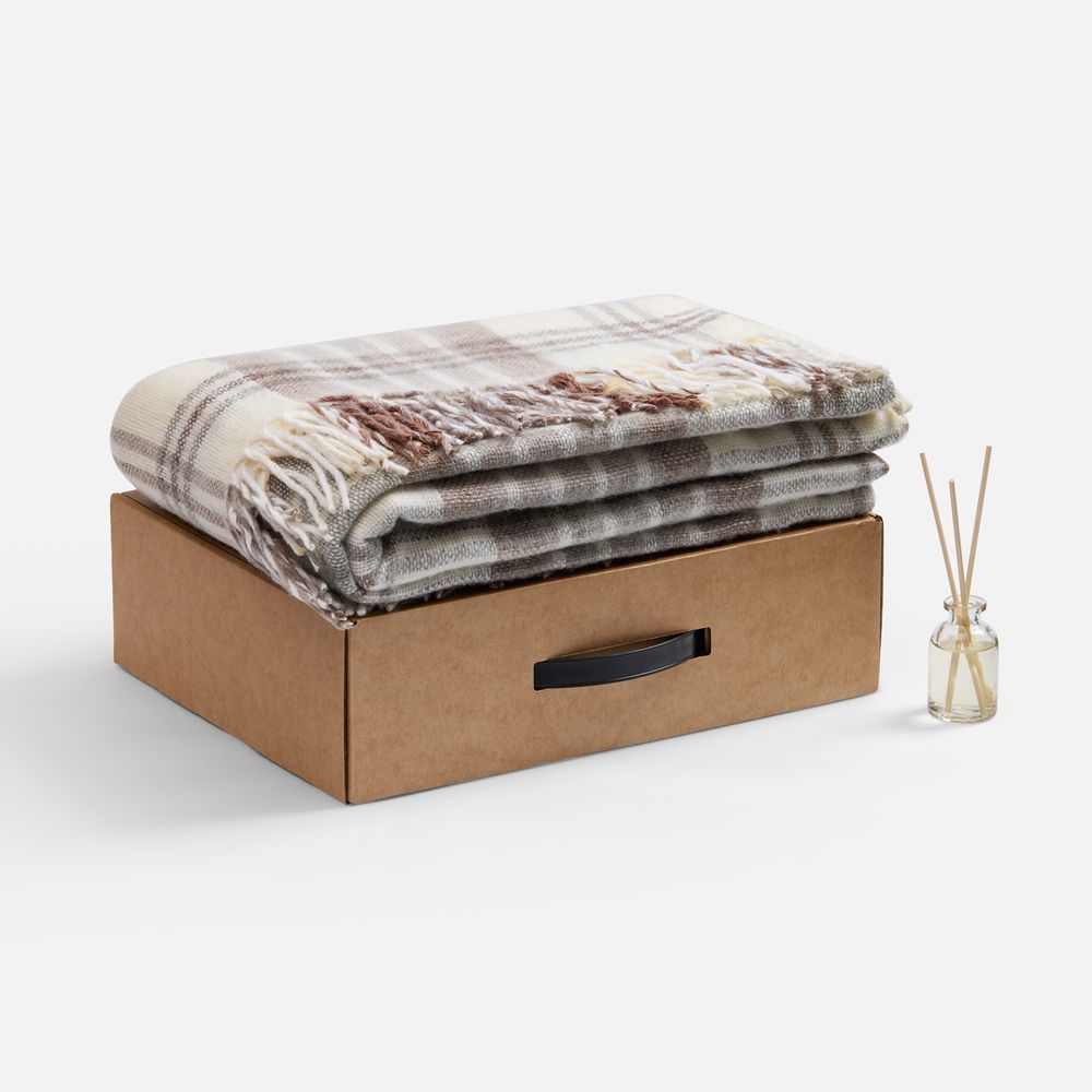 Материал: плед - шерсть 50%; полиэстер 30%; акрил 20%; флакон - стекло, палочки - дерево; коробка - микрогофрокартон