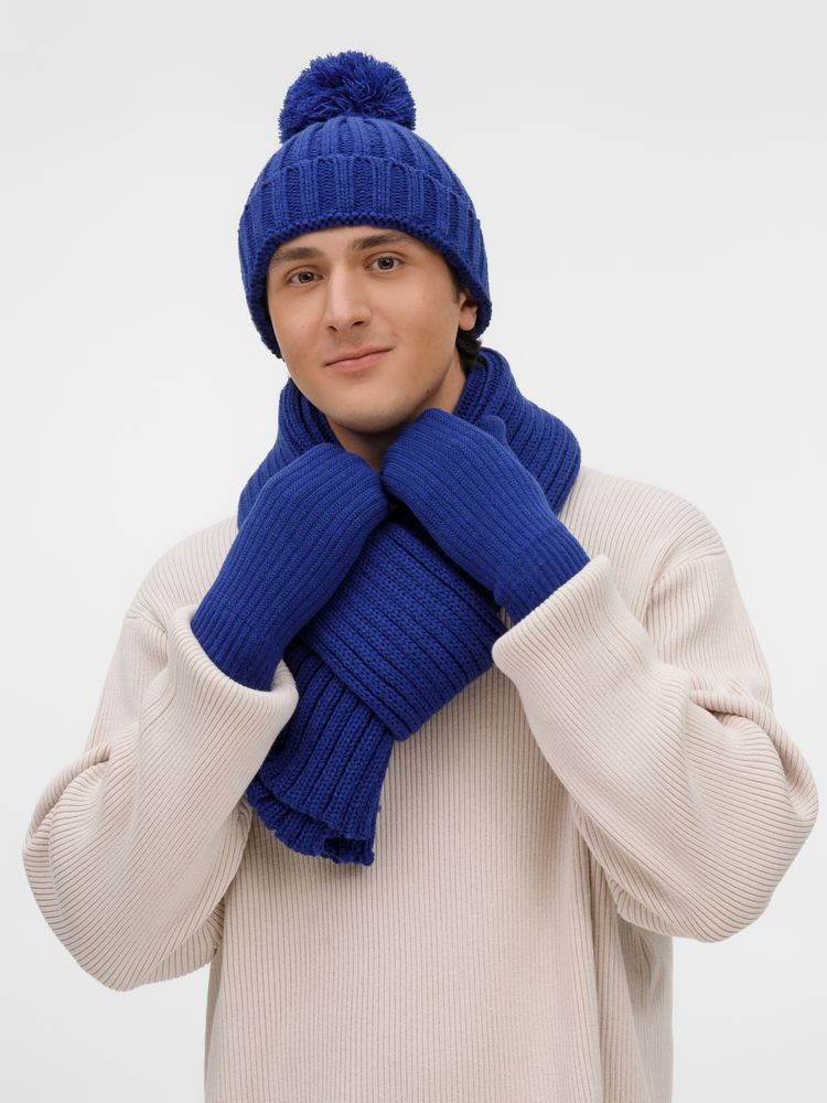Шапка с пышным помпоном и отворотом, связанная крупной резинкой создает игривый силуэт, а широкий шарф с выразительной текстурой надежно защищает от ветра, сохраняя свободу движений. Варежки с отворотом-резинкой плотно облегают запястье, не пропуская холод.