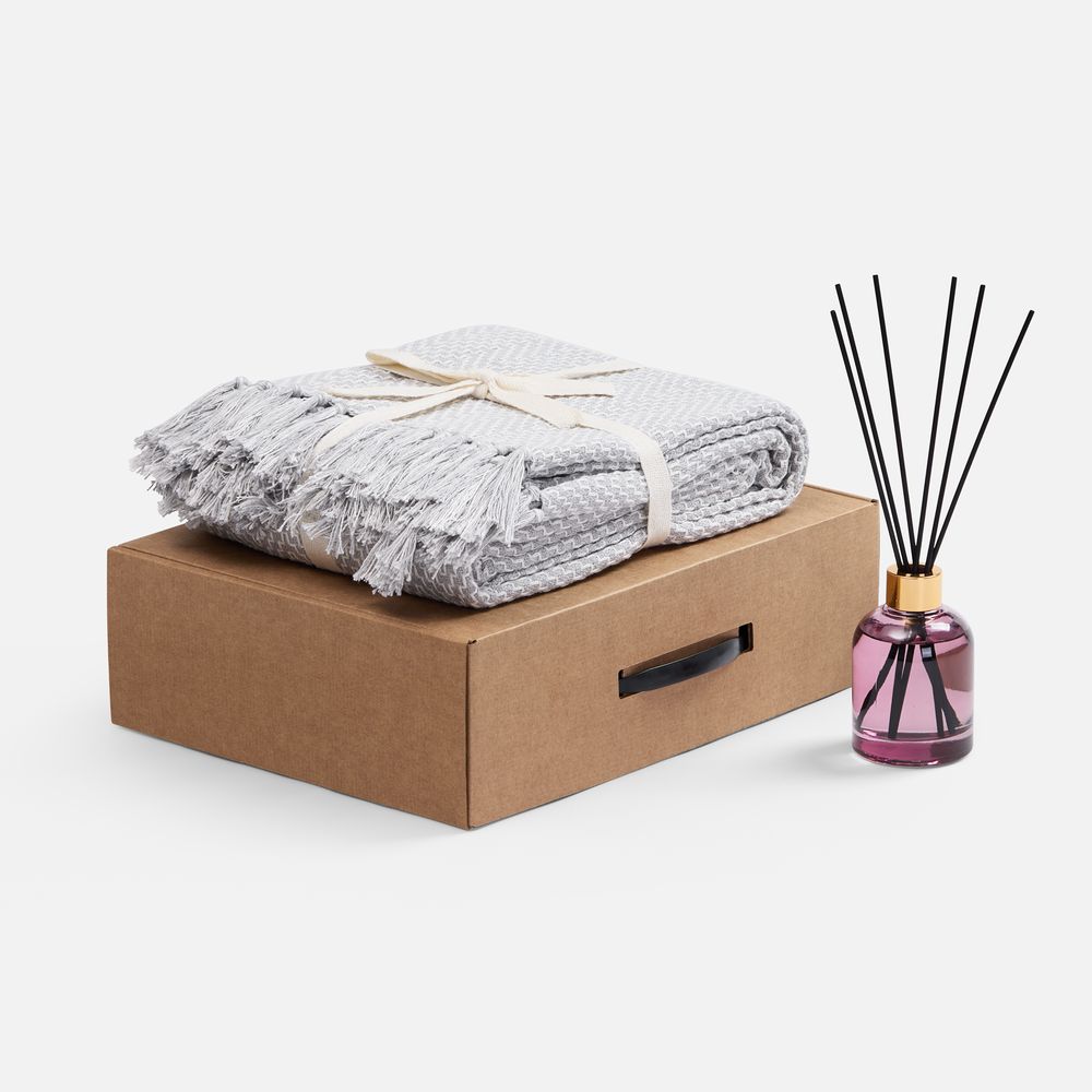 Материал: плед - хлопок 80%, полиэстер 20%, плотность 260 г/м?; флакон - стекло, палочки из файбера; коробка - микрогофрокартон