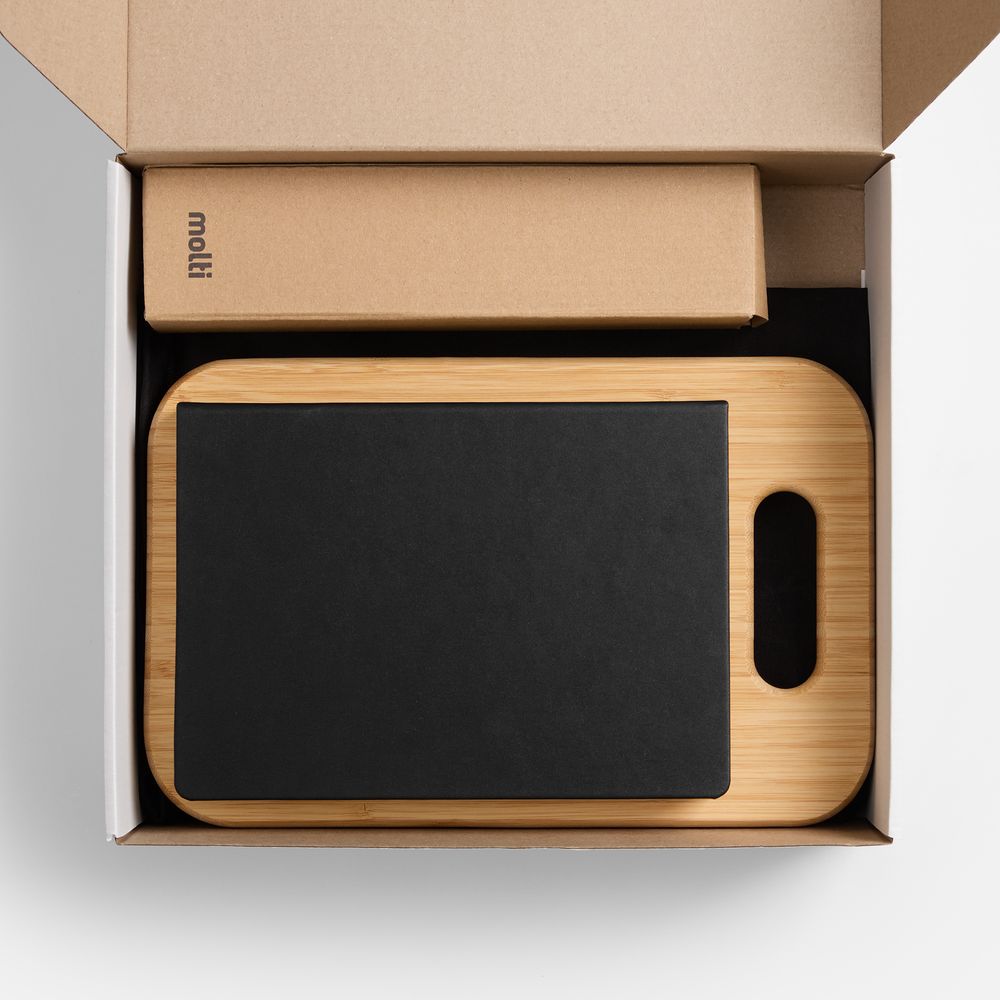 Материал: мельница - нержавеющая сталь; пластик; фартук - хлопок 100%, плотность 240 г/м?; ежедневник - покрытие софт-тач; доска - бамбук; коробка - микрогофрокартон, Т-23Е