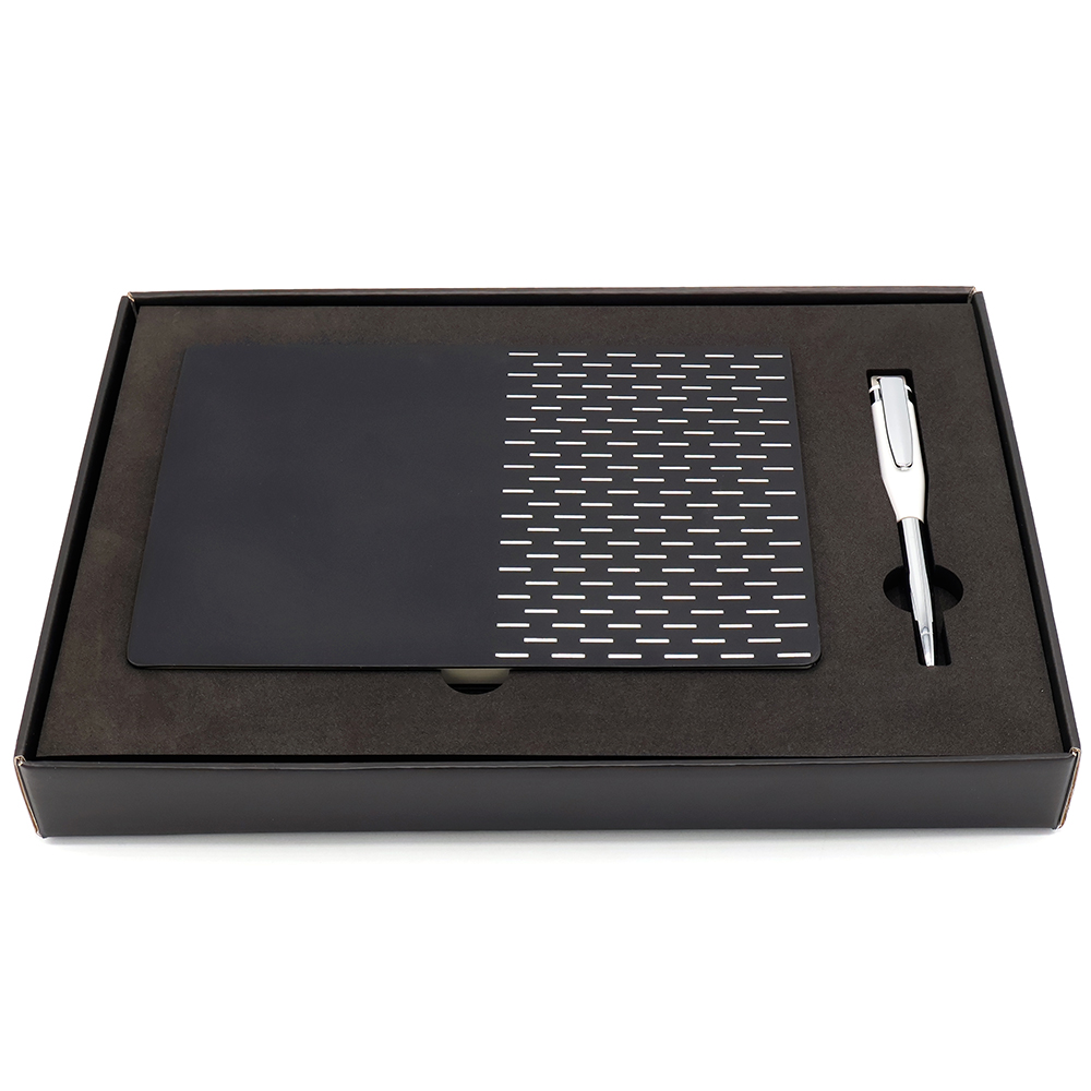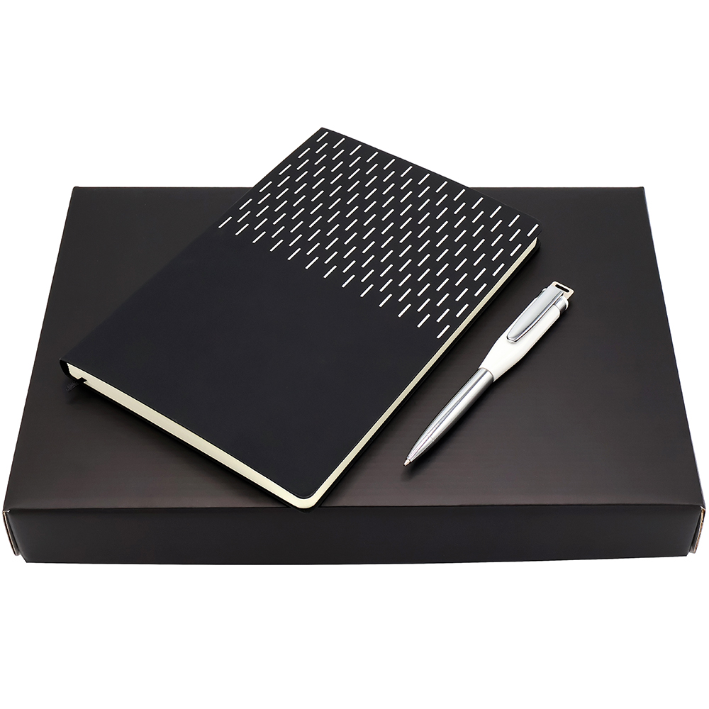 Подарочный набор в стильной цветной картонной коробке черного цвета (крышкой-дно). Внутри на аккуратном ложементе располагаются ежедневник А5 и элегантная металлическая ручка - флешка емкостью 64 ГБ.