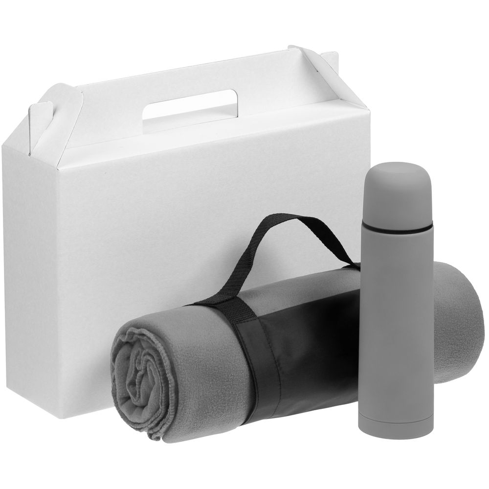 Материал: плед - флис, плотность 180 г/м?; термос - нержавеющая сталь, 304 внутри, 201 снаружи, пластик, покрытие софт-тач; коробка - микрогофрокартон