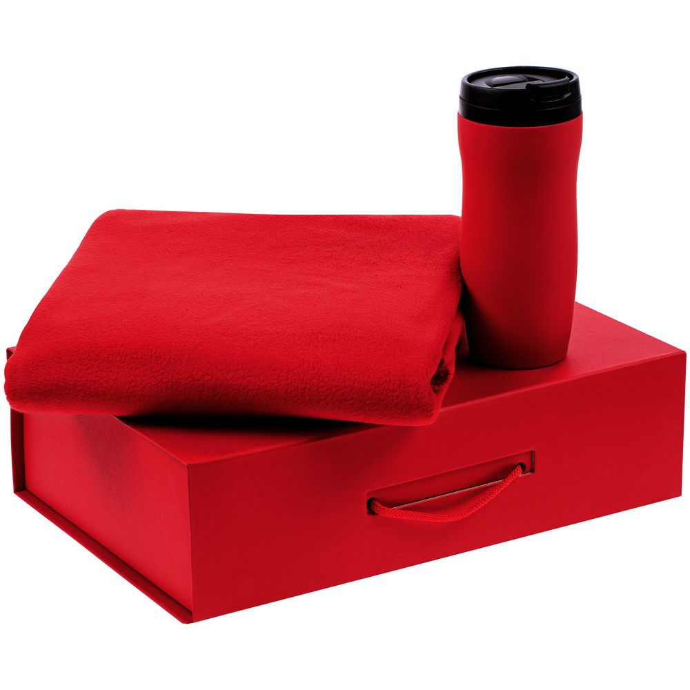 Материал: покрытие софт-тач; термостакан - пластик, крышка, внутренняя колба; нержавеющая сталь, корпус; плед - флис, плотность 180 г/м?; коробка - переплетный картон; наполнитель - бумага