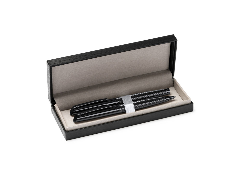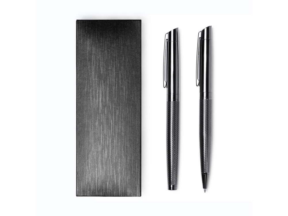 Элегантный набор, состоящий из ручки роллера и механического карандаша. Изготовлен из металла с затемненным рисунком. Поставляется в мягком футляре из кожзаменителя с внутренней подкладкой.