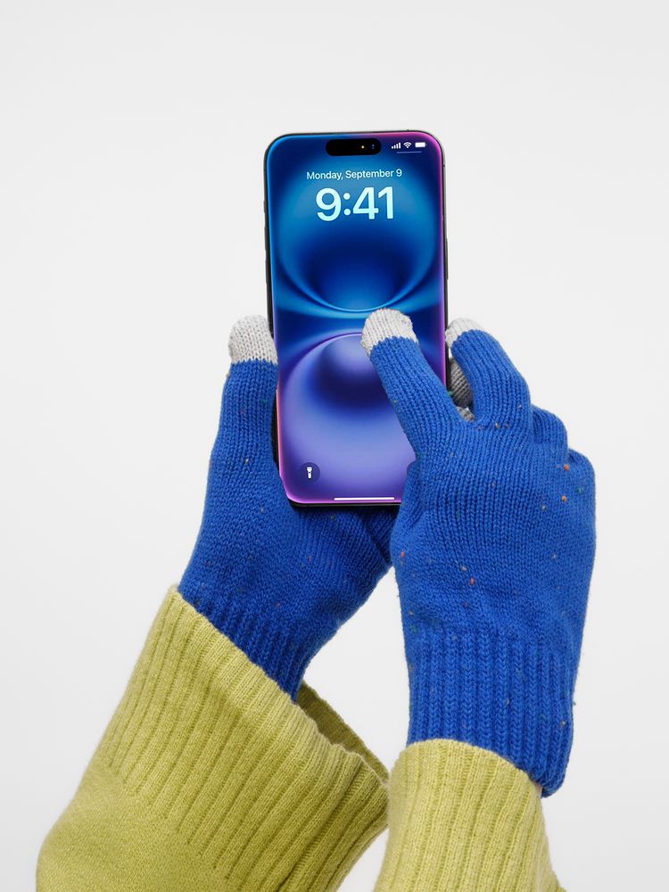 Перчатки Spotti Senso с токопроводящими волокнами на кончиках пальцев позволяют легко управлять смартфоном, не снимая их на морозе. Эргономичный крой и эластичная пряжа обеспечивают удобную посадку, сохраняя тепло и свободу движений. Как и в шапке, здесь использованы контрастные нити — визитная карточка коллекции.
