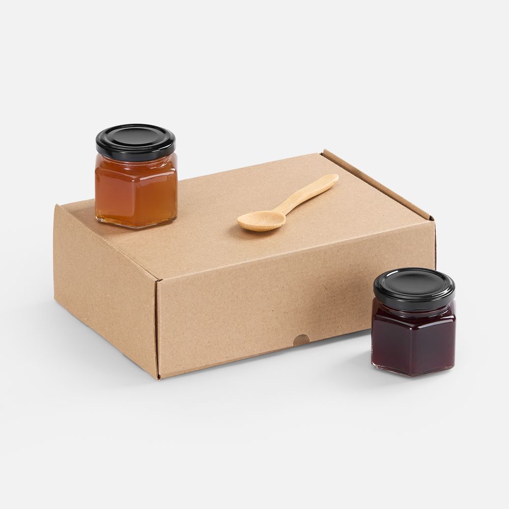 Материал: коробка - микрогофрокартон; баночки - стекло, жесть; ложка - бамбук