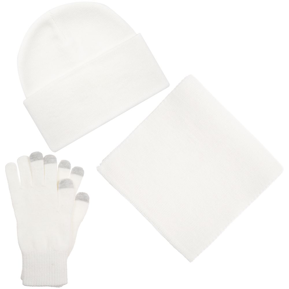В комплект входят двухслойная шапка с регулируемым отворотом и легкий однослойный шарф из мягкой акриловой пряжи, сохраняющие тепло и защищающие от ветра, а также эргономичные перчатки со специальными токопроводящими волокнами на кончиках пальцев, позволяющие свободно пользоваться смартфоном даже в холодную погоду. Универсальная цветовая гамма и лаконичный дизайн делают набор органичным дополнением к любой верхней одежде.