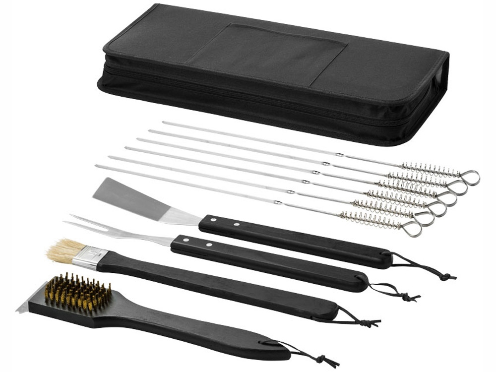 Набор для барбекю Asado из 11 предметов. Набор для барбекю включает лопатку для рыбы, кисть, вилку и щетку для очистки с деревянными ручками, шесть шампуров и чехол на молнии с передним карманом для нанесения. Нанесение не предлагается на отдельные элементы набора. Нержавеющая сталь и полиэстер 600D.