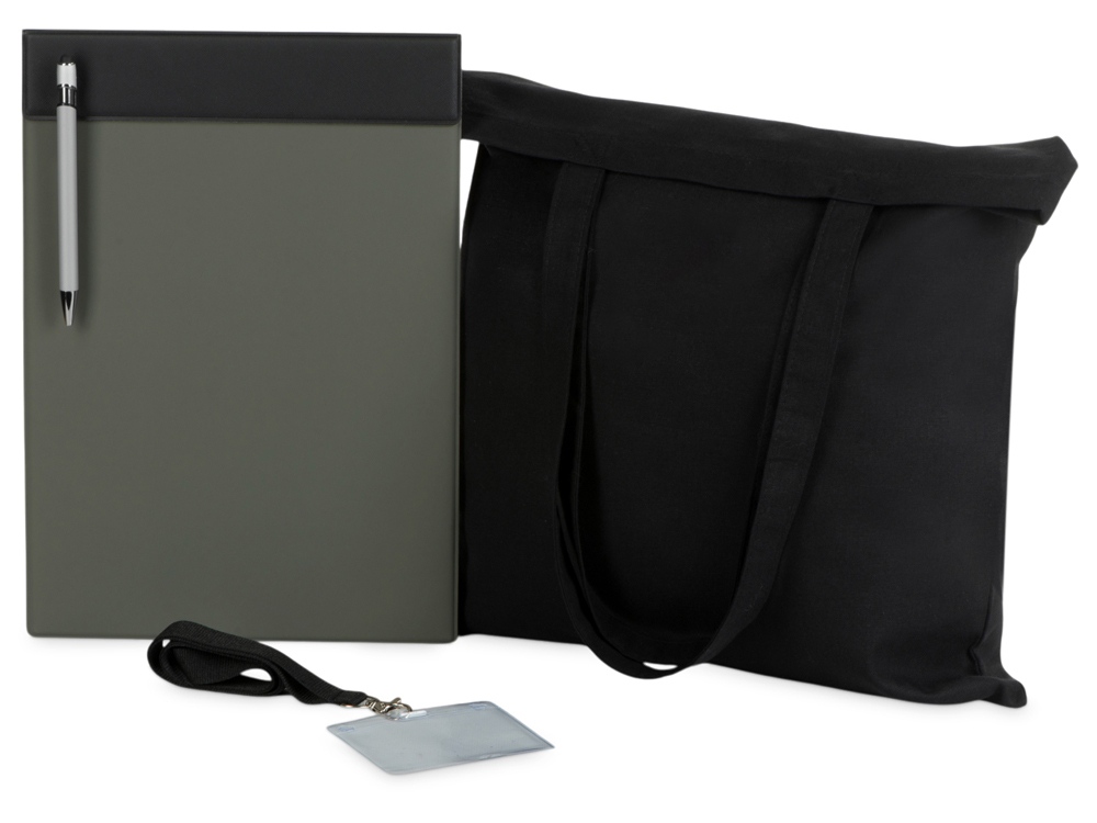 Базовый набор для конференций. В наборе: магнитный планшет для бумаг, ручка для записей, ланъярд и чехол для бейджа участника и шоппер, в который все можно удобно сложить.