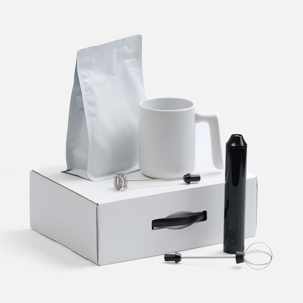 Размеры: вспениватель: 11х4,7х23,3 см; кружка: диаметр 8 см, ширина с ручкой 11,2 см, высота 10,2 см; пачка кофе: 13х4,5х18,5 см; коробка: 26,3x36,6x10 см