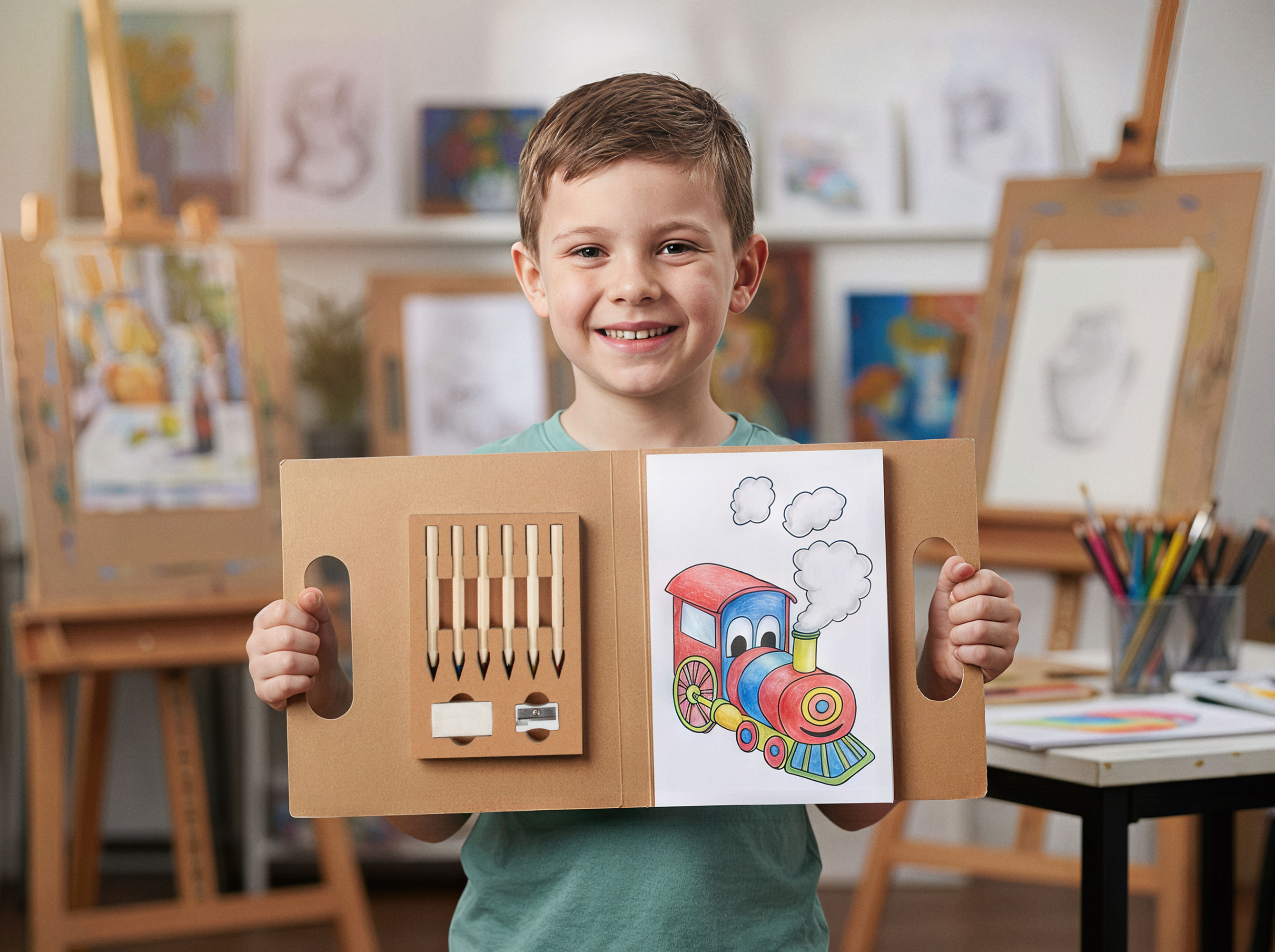 - Картонная папка позволяет удобно хранить все принадлежности и рисунки.
