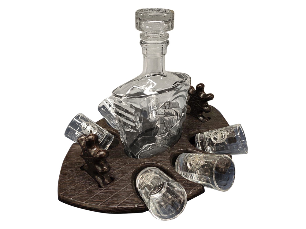 Набор для водки со штофом. В набор входит штоф 0.5 л с оловянным барельефом, шесть стопок 60 мл с оловянным барельефом и подставка мини-бар в форме корабля.