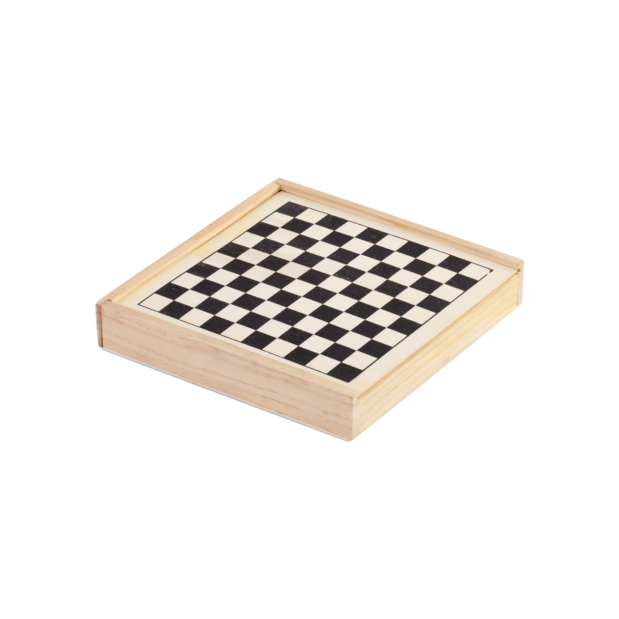 Игровое поле для шахмат и шашек нанесено прямо на выдвижную крышку футляра, обратная сторона остается чистой.